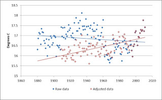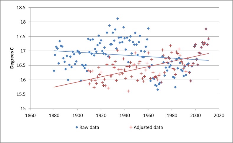 That is “global warming”. Does it really look like a crisis? But worse is to come! Like a good chemical engineer, you check on the underlying data. You find, when you do this check, that the HADCRUT curve is a figment of someone’s imagination! The raw data has been “adjusted”. Cape Town’s data, for instance, shows slight cooling since 1880, but after adjustment the picture is dramatically different: